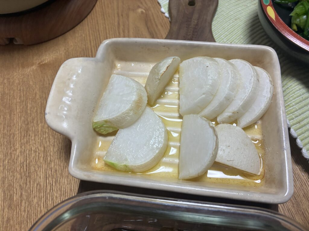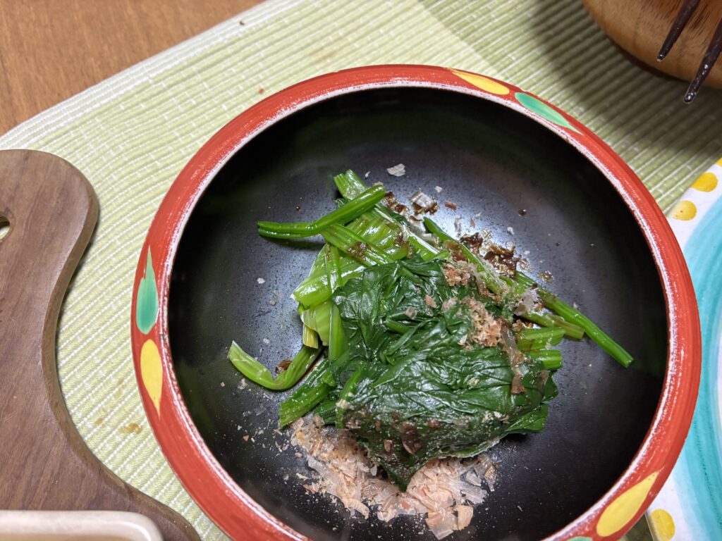 カブはオリーブオイルかけてオーブンで焼いたのみ、ほうれん草はおひたしにしました。
